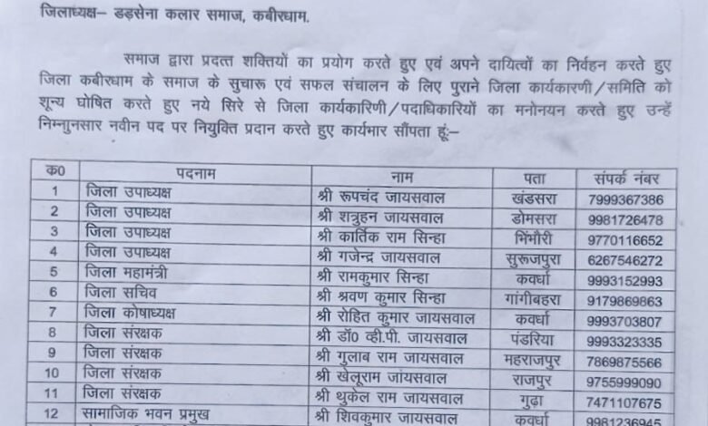 वहीं कवर्धा परिक्षेत्र में मेंलन जायसवाल, रामकुमार सिन्हा, मोतीराम सिन्हा, पूनाराम सिन्हा, नारायण जायसवाल, कुम्भकरण जायसवाल, जलेश जायसवाल, मेशरू जायसवाल, लालाराम जायसवाल, टीकाराम सिन्हा और डॉ. कोमल जायसवाल को कार्यकारिणी में शामिल किया गया है।