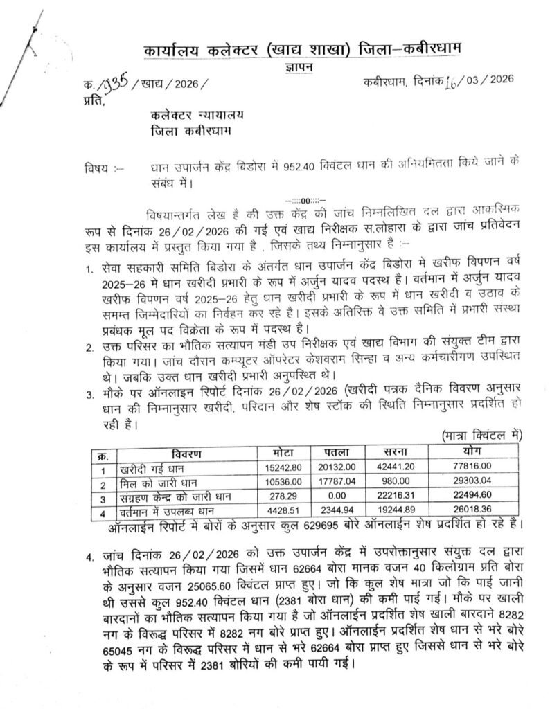 हाल ही में जिले के बघर्रा, बाघामुड़ा और रमतला उपार्जन केंद्रों में जांच के दौरान लगभग 4472 क्विंटल धान गायब पाया गया, जिसकी कीमत करीब 1 करोड रुपए से अधिक का अनियमियता आया है ठीक इसके बाद नया मामला सेवा सहकारी समिति बिडोरा में 22 लाख 26 हजार 235 रूपए का धान कमी पाया गया है।जांच कमेटी का विवरण केंद्र की जांच निम्नलिखित दल द्वारा आकस्मिक रूप से दिनांक 26 फरवरी 2026 की गई एवं खाद्य निरीक्षक सहसपुर लोहारा द्वारा जांच प्रतिवेदन इस कार्यालय में प्रस्तुत